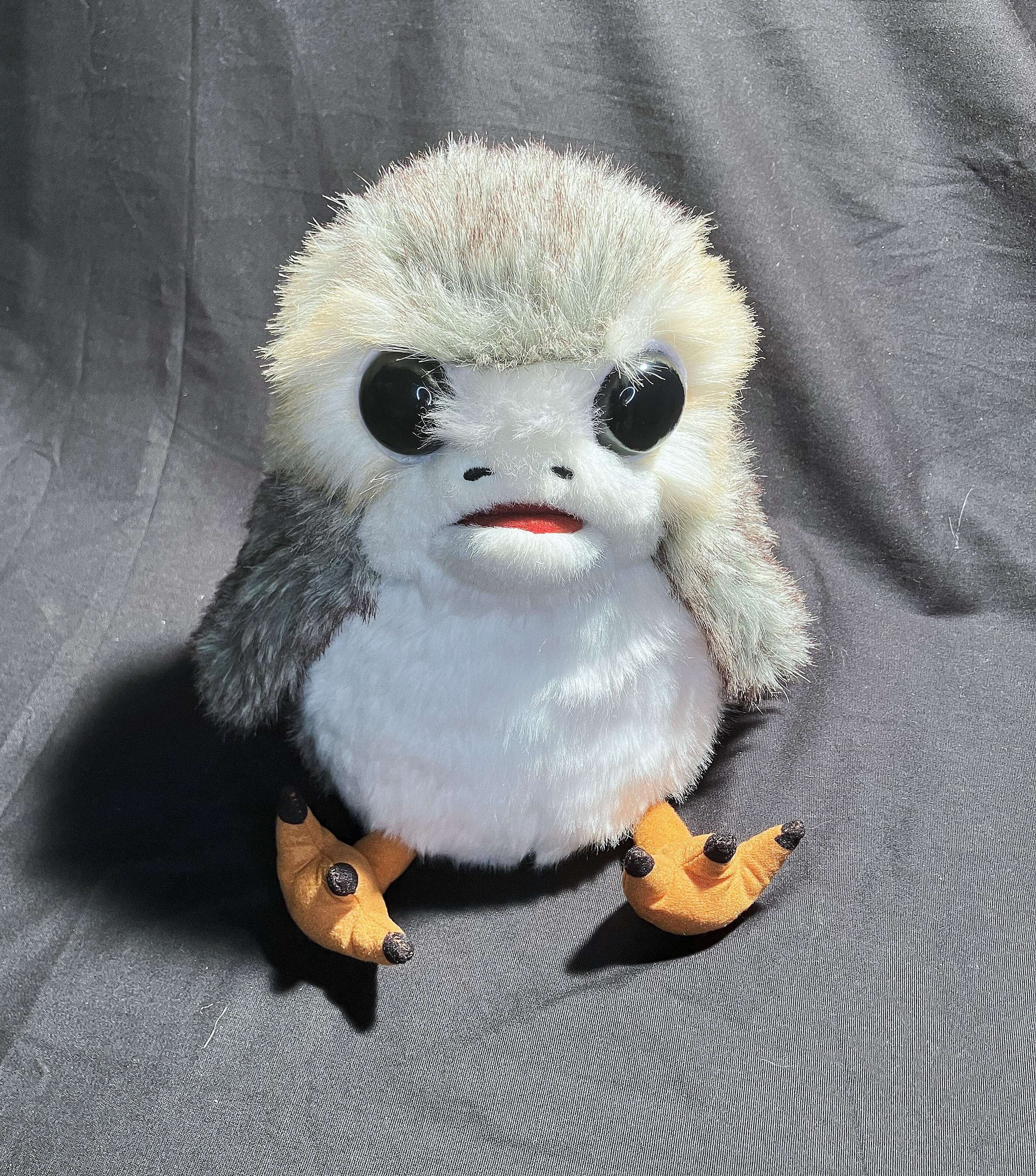 Description: Meet the Porg - the small, flat-muzzled avians that flock about the rocks and roost in the cliffs of Luke Skywalker's secluded island! Porgs are inquisitive creatures that make great friends. This Porg has a moving mouth & wings and makes three different sounds.