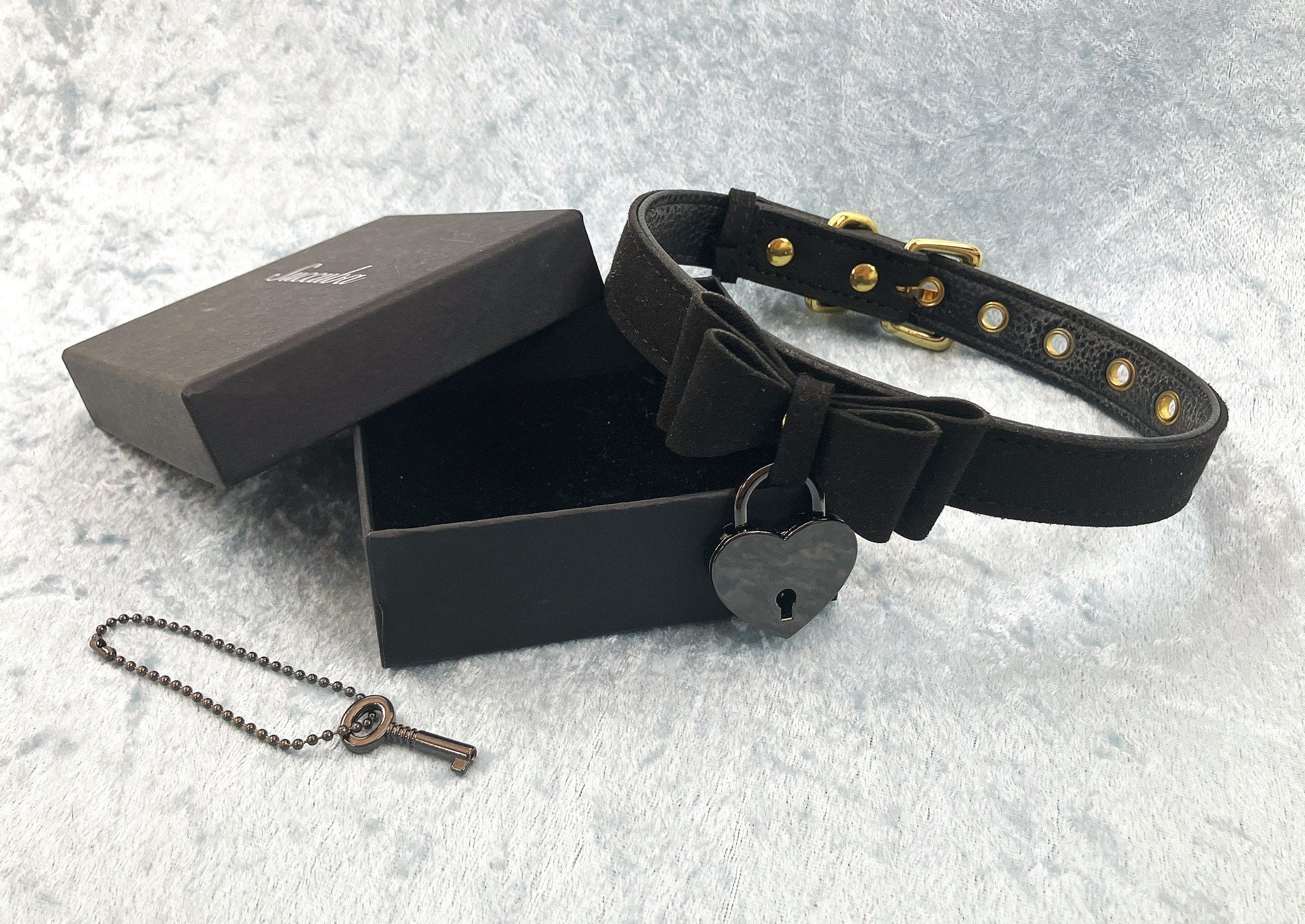 Never used. IN BOX. Leather and suede. With bow, heart lock, and key.