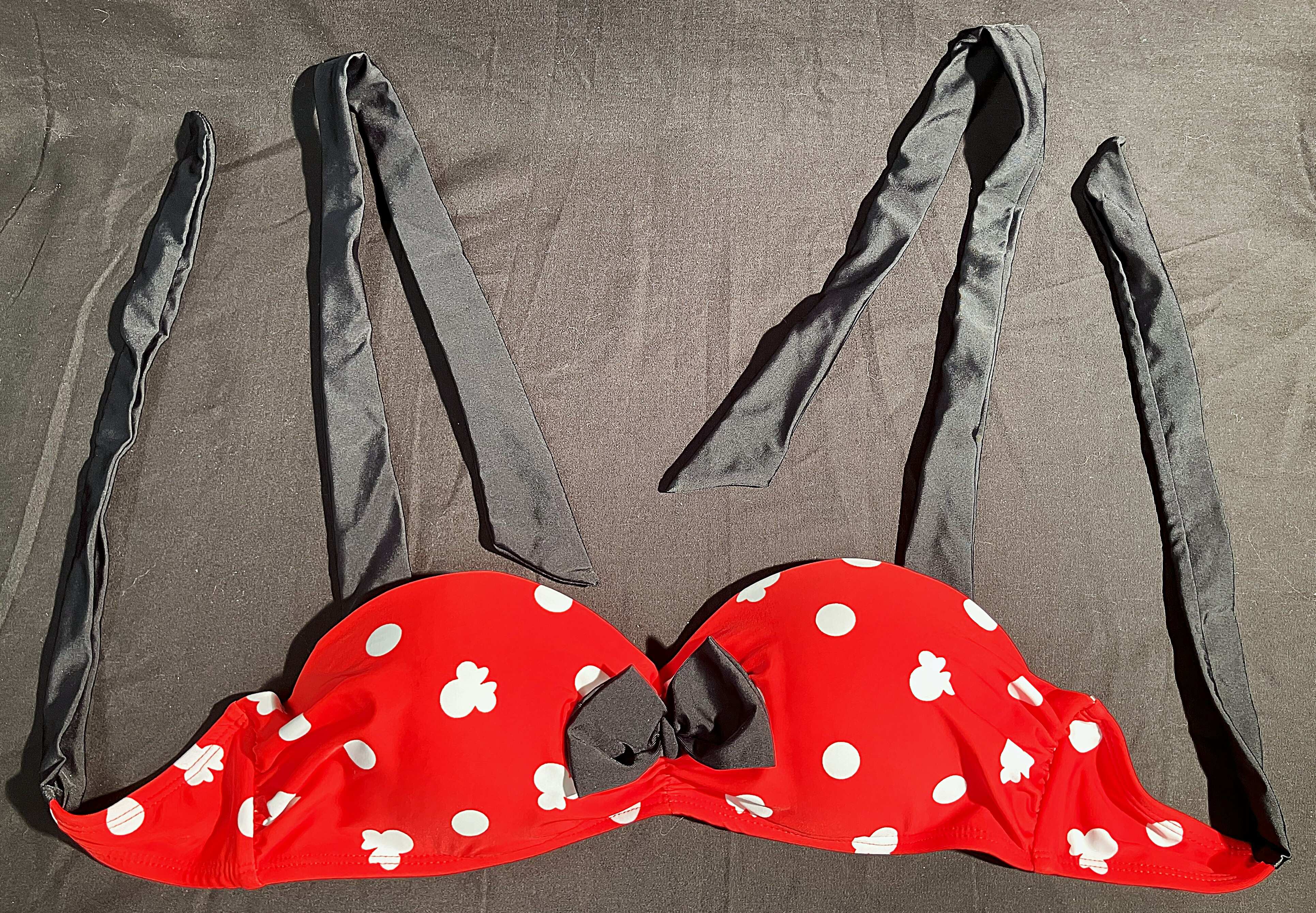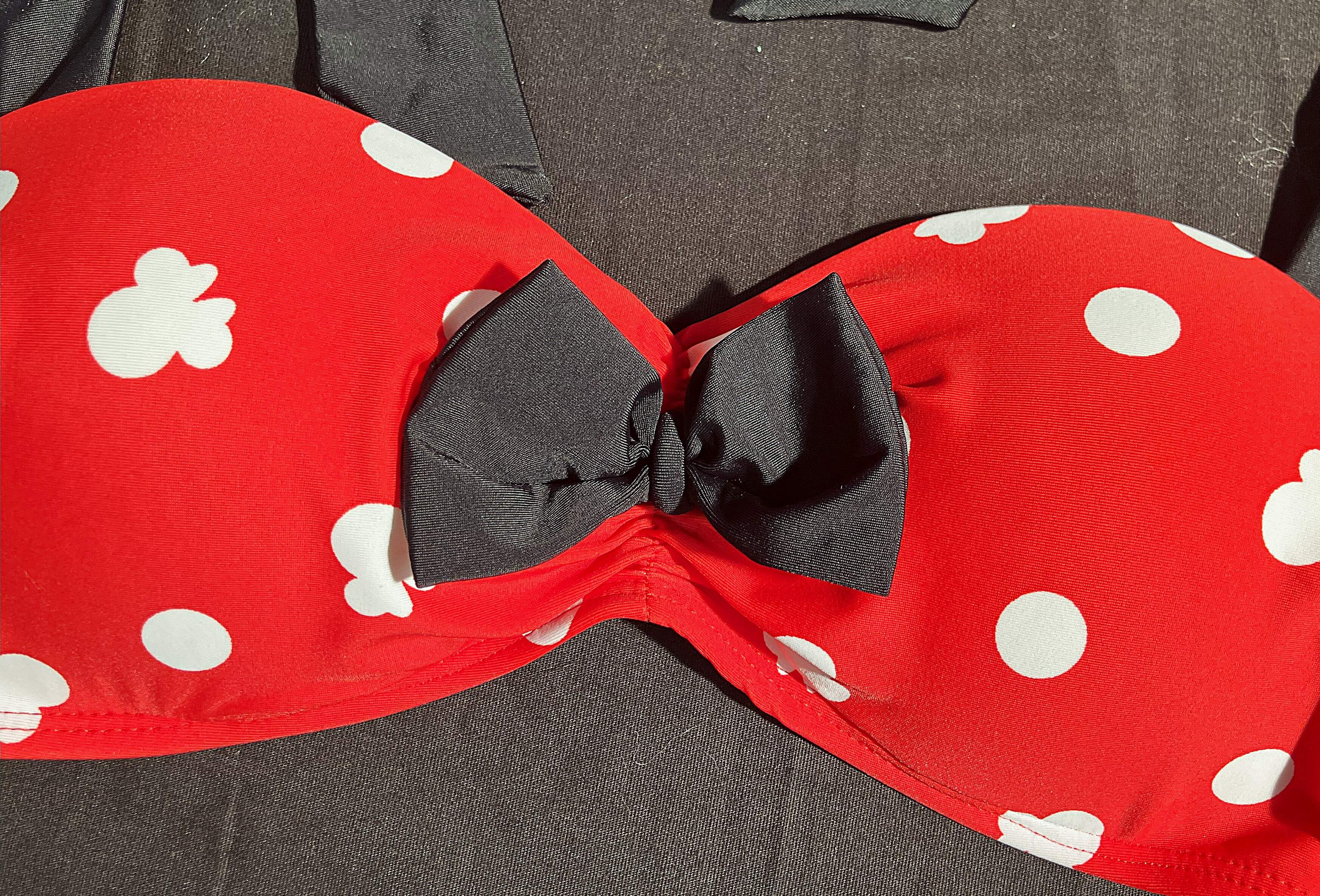 This two-piece bikini swimwear set featuring the iconic Minnie Mouse polka dot print in red, white, and black.